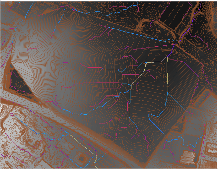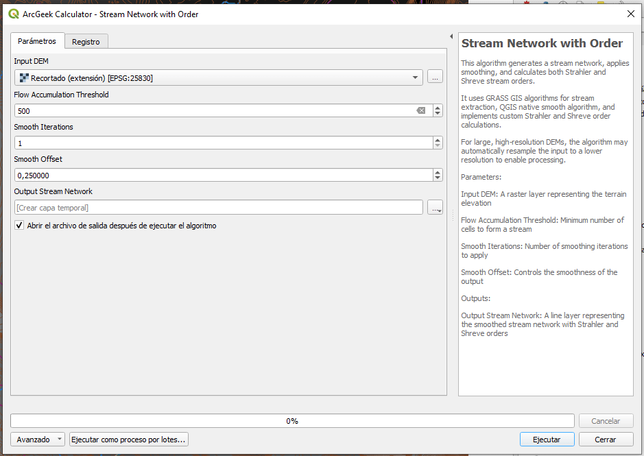 - Red de arroyos con orden: Genera una red de arroyos con orden de Strahler.